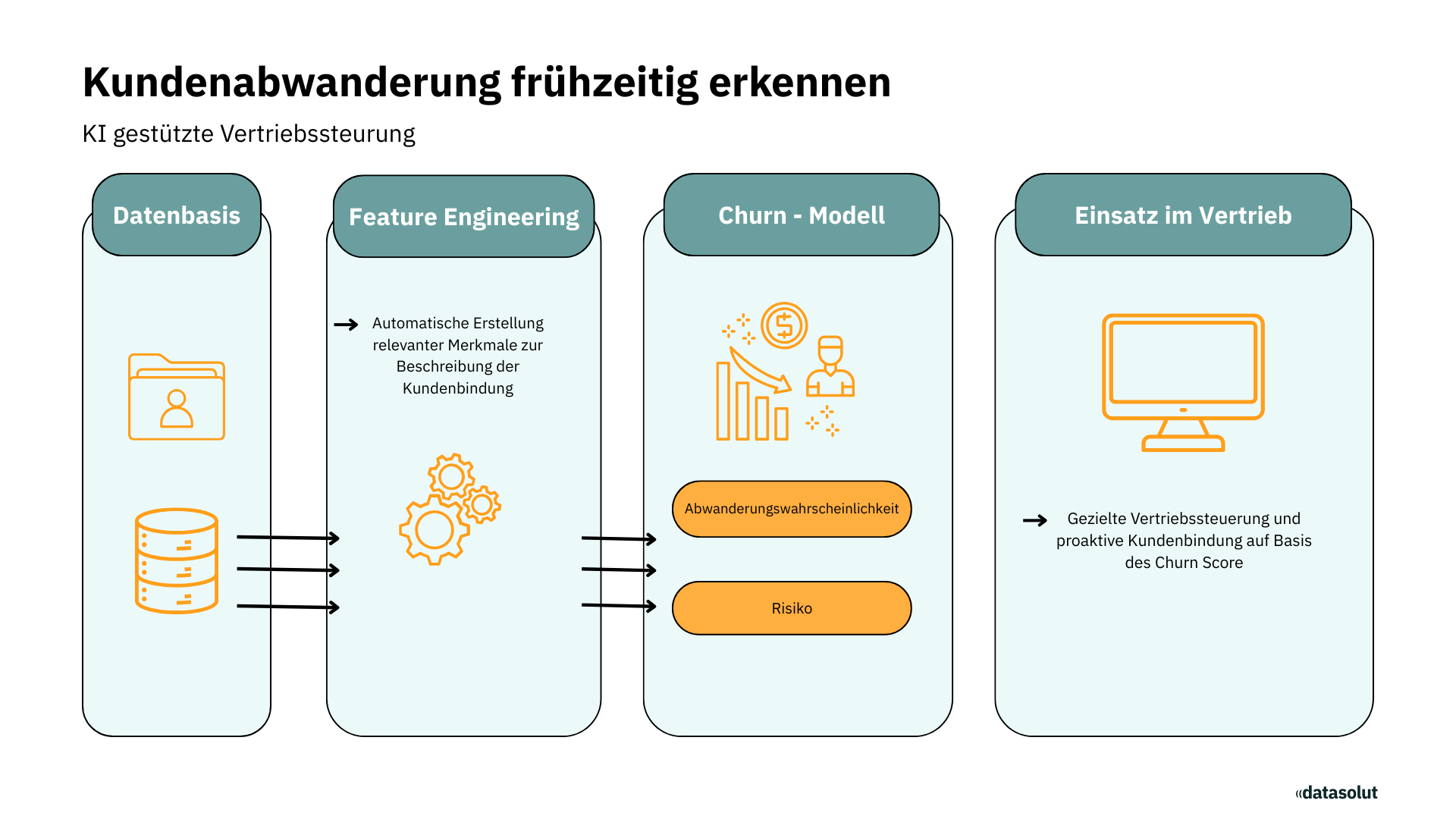 Das Ergebnis ist eine automatisierte, regelmäßig aktualisierte Churn-Prognose, die als Grundlage für eine proaktive Kundenbindung und gezielte Vertriebsmaßnahmen dient.