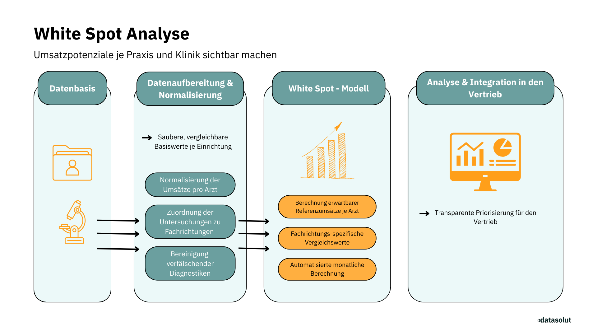 Als Lösungsansatz entwickelte Datasolut eine White Spot Analyse auf Databricks, die automatisch Praxen und Kliniken mit hohem ungenutztem Umsatzpotenzial erkennt. Grundlage waren historische Untersuchungsdaten, Umsatzdaten und Stammdaten der medizinischen Einrichtungen.