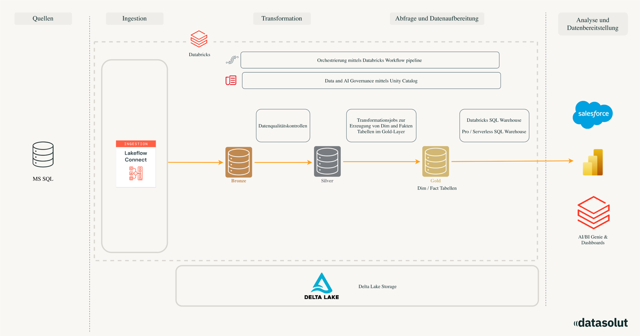 Das übergeordnete Ziel war es, Daten effizient zu integrieren und zu prozessieren, wobei wir im Projektverlauf flexibel auf neue Anforderungen reagierten: Während zu Beginn noch Salesforce und Power BI als Zielsysteme im Gespräch waren, passten wir den Projektscope agil an und fokussierten uns schließlich auf die Nutzung im Databricks Genie Space.